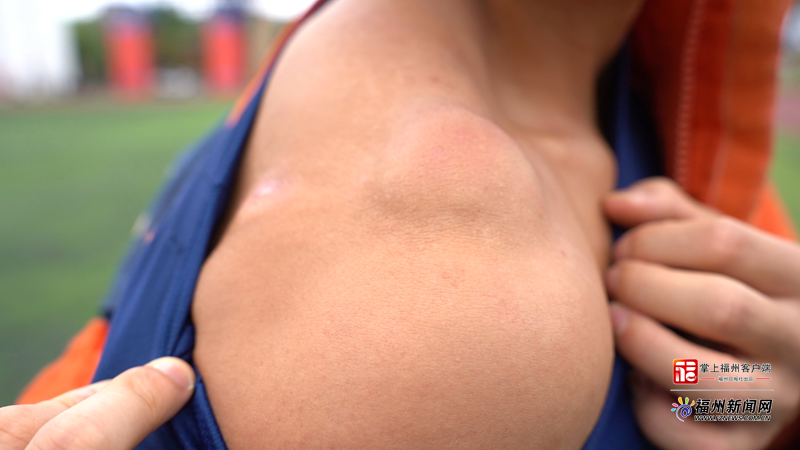熊尚文肩头因常年扛梯训练早已磨出明显骨突。受访者供图