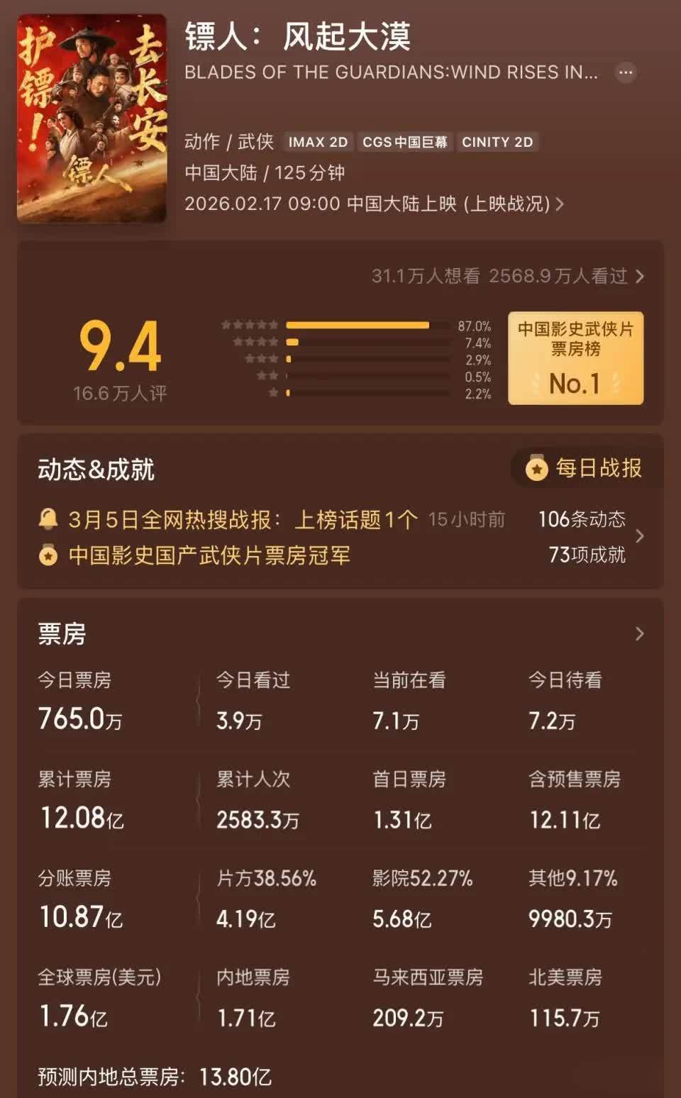 豆瓣评分7.5,票房目前为12亿+,平台预计最终大概会停在13-14亿之间。